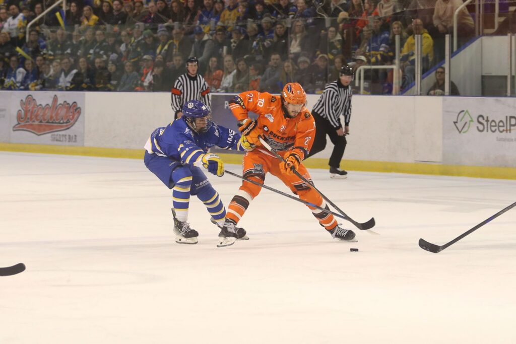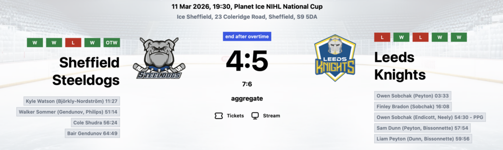Steeldogs were 3-1 up after the first leg but the Knights hit back winning the game in regulation 5-3 for a 6-6 tie