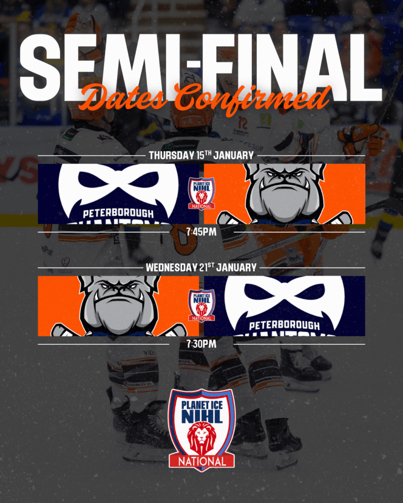 The Sheffield Steeldogs are pleased to confirm the dates and face-off times for the two-legged Cup Semi-Final against the Peterborough Phantoms.