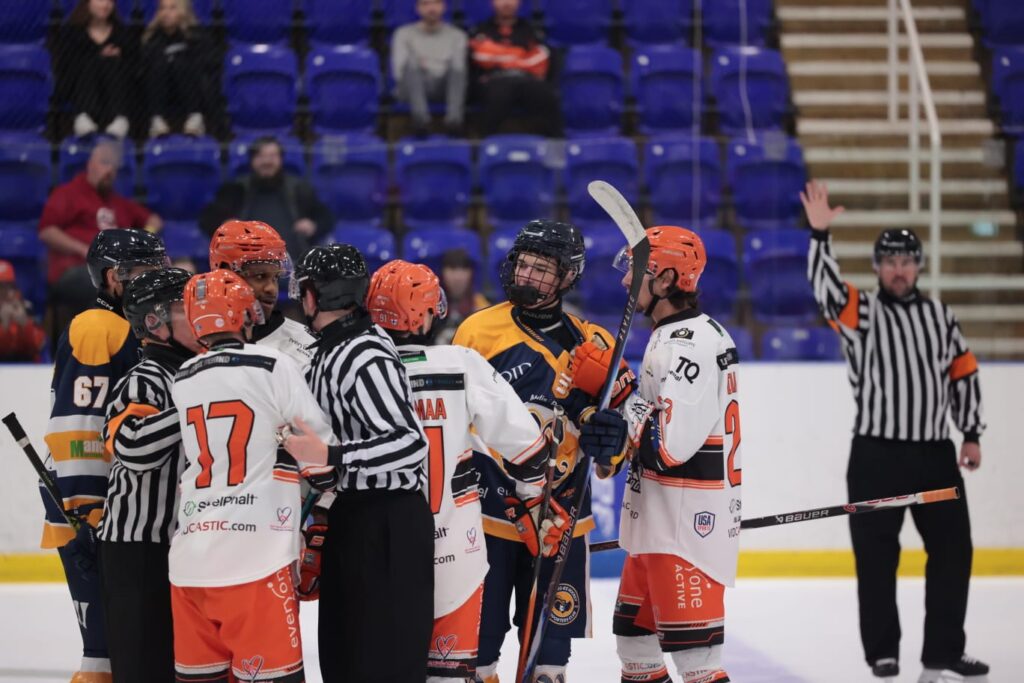 The third period was full of action! At 41:10 the Steeldogs got a fourth goal with Kyle Watson sniping the puck past Ceci. Bair Gendunov and Joonas Larinmaa were awarded the assists. Romford soon answered back once again with Michael Power getting the Raiders third of the night. A small matter of minutes later Steeldogs got a fifth this time through Bair Gendunov assisted by CJ Garcia and Joonas Larinmaa. Just ten seconds later Jake Sylvester sniped the puck past Oldale for his second goal of the game at 48:16. Another couple of minutes went by before the Steeldogs got their sixth of the night, this time on the powerplay with Liam Steele finding the back of the net at 50:31. Both Ivan Bjorkly-Nordstrom & Jonathan Phillips were awarded the assists. The Steeldogs were flying. Another ten seconds went by when the Steeldogs added an seventh at 50:41! Walker Sommer scored his fouth goal of the night with a beautiful setup from Ivan Bjorkly-Nordstrom. Less than two minutes went by before Joonas Larinmaa scored the Steeldogs’ eighth of the night with Kyle Watson and Bair Gendunov getting themselves an assist. Romford opted for a netminder change with Owen Rider coming in to replace Cole Ceci. Less than fourty seconds and Romford got themselves a fifth with Jake Sylvester getting his hattrick. A small bit of hope was restored for the Raiders as they went and scored a sixth at 57:16 through Shaun Miller. Just over 30 seconds went by when Michael Danecko scored his first goal of the season at 57:48 assisted by Nathan Ripley!